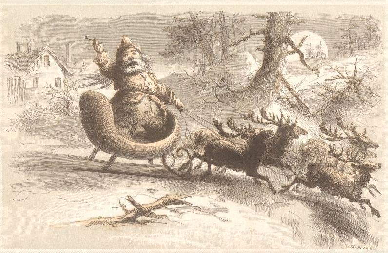 | "Now, Dasher! now, Dancer! now, Prancer and Vixen! On! Comet, on! Cupid, on! Dunder and Blitzen— To the top of the porch, to the top of the wall! Now, dash away, dash away, dash away all!" As dry leaves that before the wild hurricane fly, When they meet with an obstacle, mount to the sky, So, up to the house-top the coursers they flew, With a sleigh full of toys—and St. Nicholas too. And then in a twinkling I heard on the roof, The prancing and pawing of each little hoof. As I drew in my head, and was turning around, Down the chimney St. Nicholas came with a bound. He was dressed all in fur from his head to his foot, And his clothes were all tarnished with ashes and soot; A bundle of toys he had flung on his back, And he looked like a peddler just opening his pack; His eyes how they twinkled! his dimples how merry! His cheeks were like roses, his nose like a cherry; His droll little month was drawn up like a bow, And the beard on his chin was as white as the snow; The stump of a pipe he held tight in his teeth, And the smoke, it encircled his head like a wreath. He had a broad face, and a little round belly That shook when he laughed, like a bowl full of jelly. He was chubby and plump—a right jolly old elf; And I laughed when I saw him in spite of myself. A wink of his eye, and a twist of his head, Soon gave me to know I had nothing to dread. He spoke not a word, but went straight to his work, And filled all the stockings; then turned with a jerk, And laying his finger aside of his nose, And giving a nod, up the chimney he rose. He sprang to his sleigh, to his team gave a whistle, And away they all flew like the down of a thistle; But I heard him exclaim, ere he drove out of sight, "Merry Christmas to all, and to all a good night!"